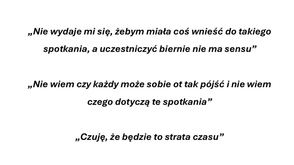 W otwartych odpowiedziach pojawiały się konkretne przykłady, jak np. „Nie mam z kim zostawić dzieci” czy „Termin mi nie pasował”. To zrozumiałe i realne przeszkody. Jednocześnie pojawia się pytanie: czy jest szansa, że udałoby się znaleźć te dwie godziny 2–3 razy w roku? Być może świadomość, że podczas tych spotkań realnie wpływamy na życie naszej wsi, będzie dodatkową motywacją.