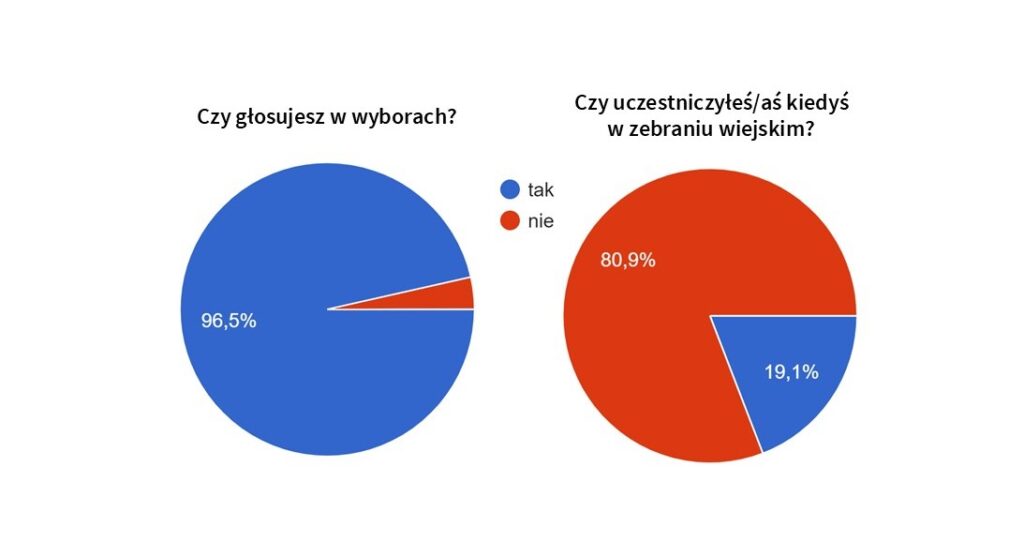 Aż 96,5% uczestników ankiety zadeklarowało, że bierze udział w wyborach – to bardzo wysoki i budujący wynik. Jednocześnie 81% respondentów przyznało, że nigdy nie uczestniczyło w zebraniu wiejskim.