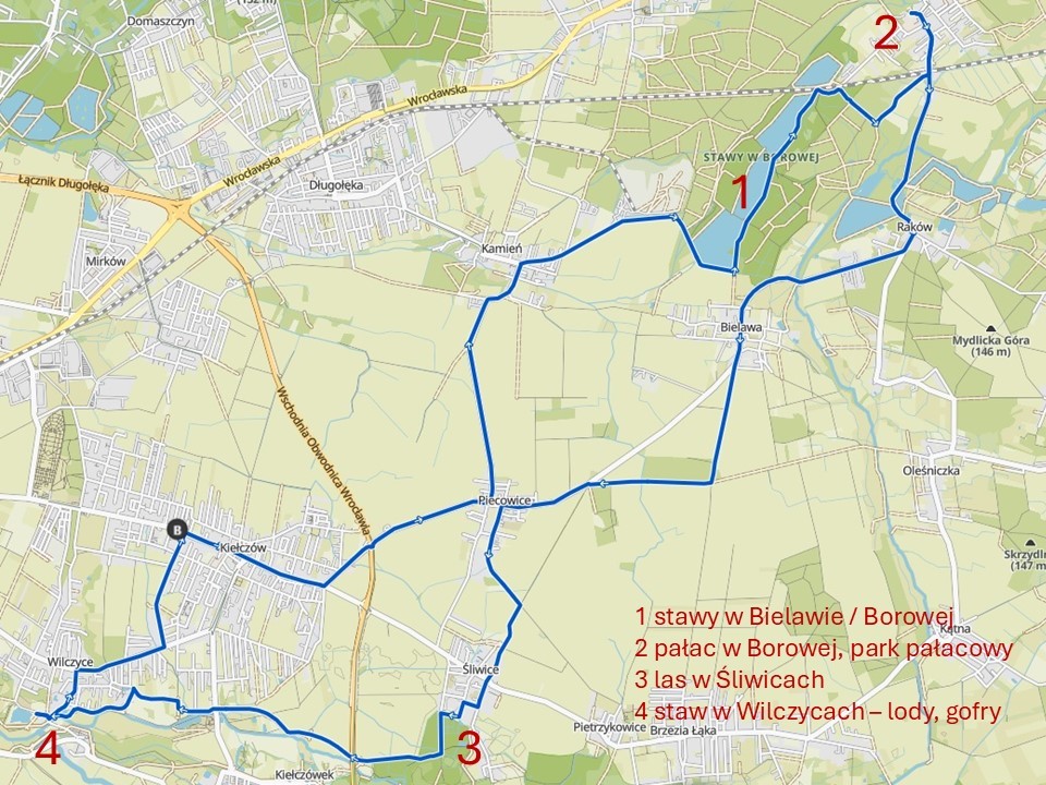 Opis trasy: Trasa wiejsko-przyrodnicza po miejscowościach i lasach Gminy Długołęka. Prowadzi przez jedno z najpiękniejszych (oczywiście subiektywnie) miejsc w gminie – stawy w Bielawie, które są siedliskiem wielu gatunków ptaków, w tym czapli białych i siwych. W Borowej warto nie tylko spojrzeć na pałac, ale zapuścić się dalej – do przestrzeni za pałacem, która zrobi wrażenie zwłaszcza na miłośnikach zarośniętych, leśnych parków i starych drzew. Powrót przez urokliwy las w Śliwicach, z którego wyjeżdżamy prosto na wał Widawy prowadzący do Wilczyc na lody.