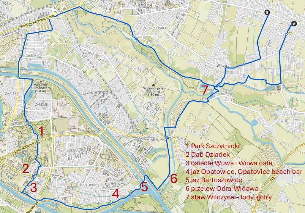 Trasa dojazdowa prowadzi wałami Widawy oraz wrocławskimi ścieżkami rowerowymi, wałami i parkami. U celu WUWA Cafe zaprasza Was na kawę i desery, a dalej OpatoVice na burgery i piwo. Lub lemoniadę 🙂