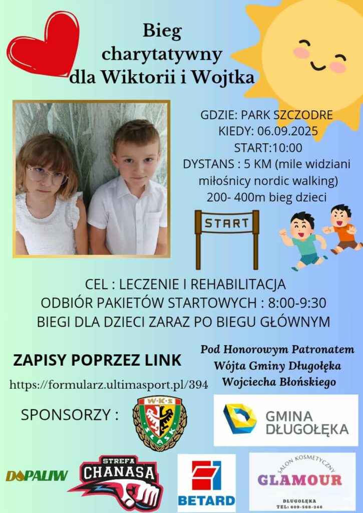 Zapraszamy na bieg charytatywny dla Wiktorii i Wojtka Kolba z którego dochód przeznaczony zostanie na leczenie i rehabilitacje w walce z autyzmem i niedoczynnością tarczycy.