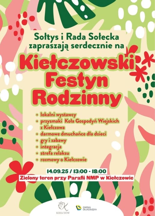 14 września Sołtys Kiełczowa wraz z Radą Sołecką zaprasza na Kiełczowski Festyn Rodzinny, który odbędzie się na zielonym terenie Parafia pw. NMP Różańcowej w Kiełczowie.